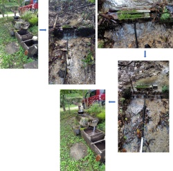 昨日と一昨日強めの雨が降り続き、水かさが増し、木の葉や木片、あるいは土砂などが流れ込み、山水の取口が詰まったものと思われる。