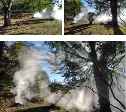 乾燥が進んでいるとは言え、炎はほとんど出ず、白い煙がもうもうと上がる。外に出ていたMがその帰り道、もうもうと出る白い煙を遠くから見て、写真に納めてくれた。