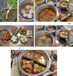 大根はMが作った取立てのもの。角を取り、コメのとぎ汁がないので米を一掴み入れて下茹でする。そのほかにも鍋が二つ。ゆで玉子を作るもの、そしてメインの大鍋。だしをとるため最初に鶏肉を入れて煮込む。